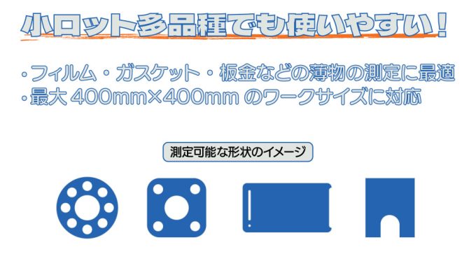 複数の検査物を同時に測定でき、フィルム、板金、ガスケットなど薄物の測定に最適です。